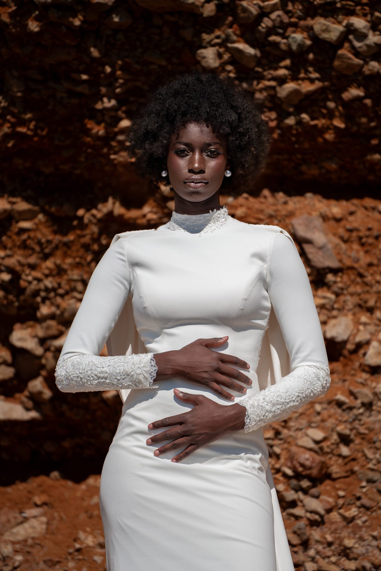 Son allure se distingue par un jeu subtil de volumes sur les épaules et des broderies délicates qui effleurent la peau.