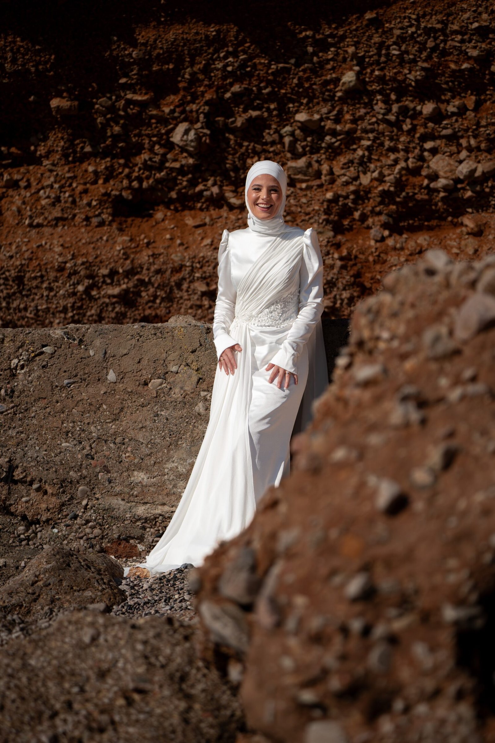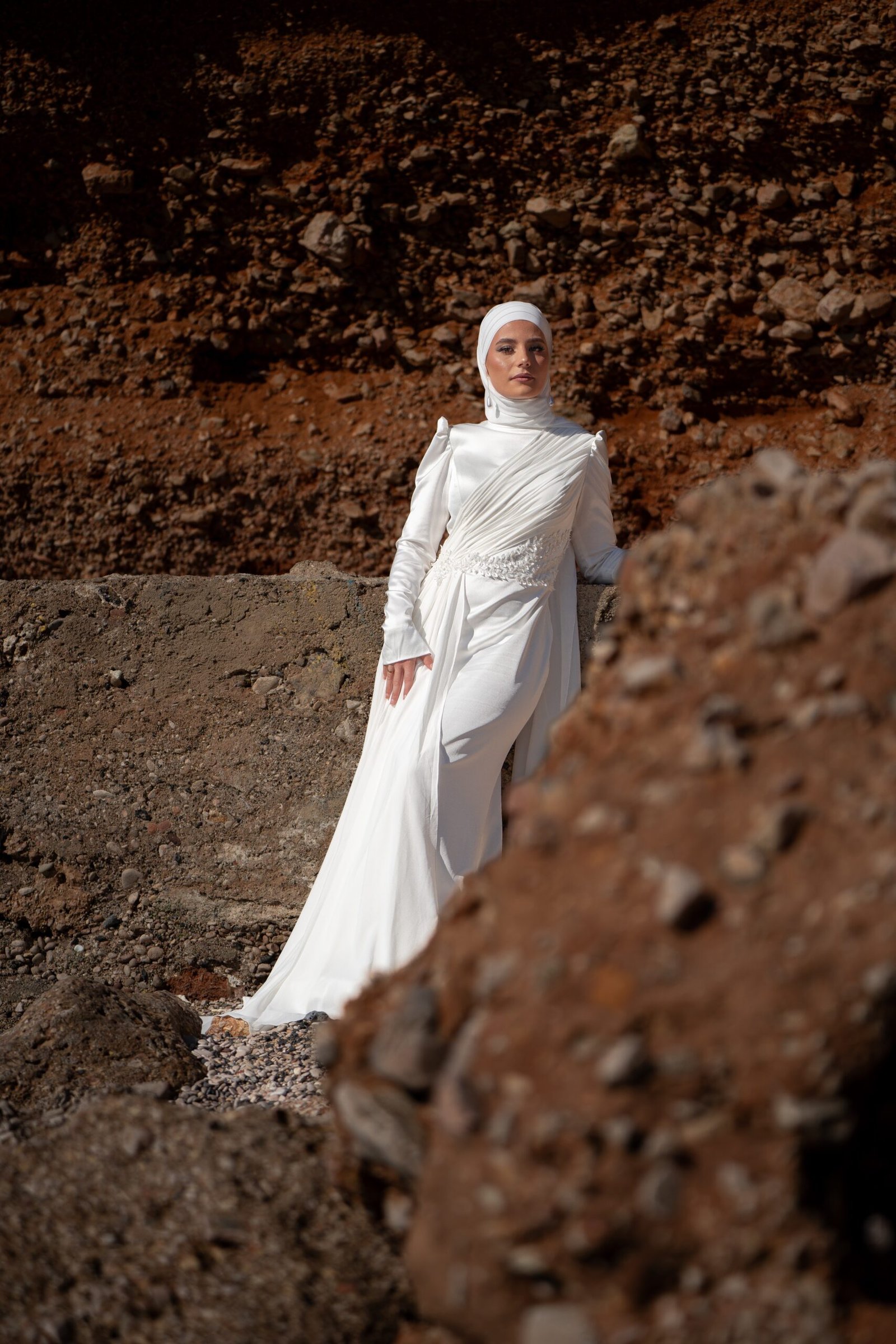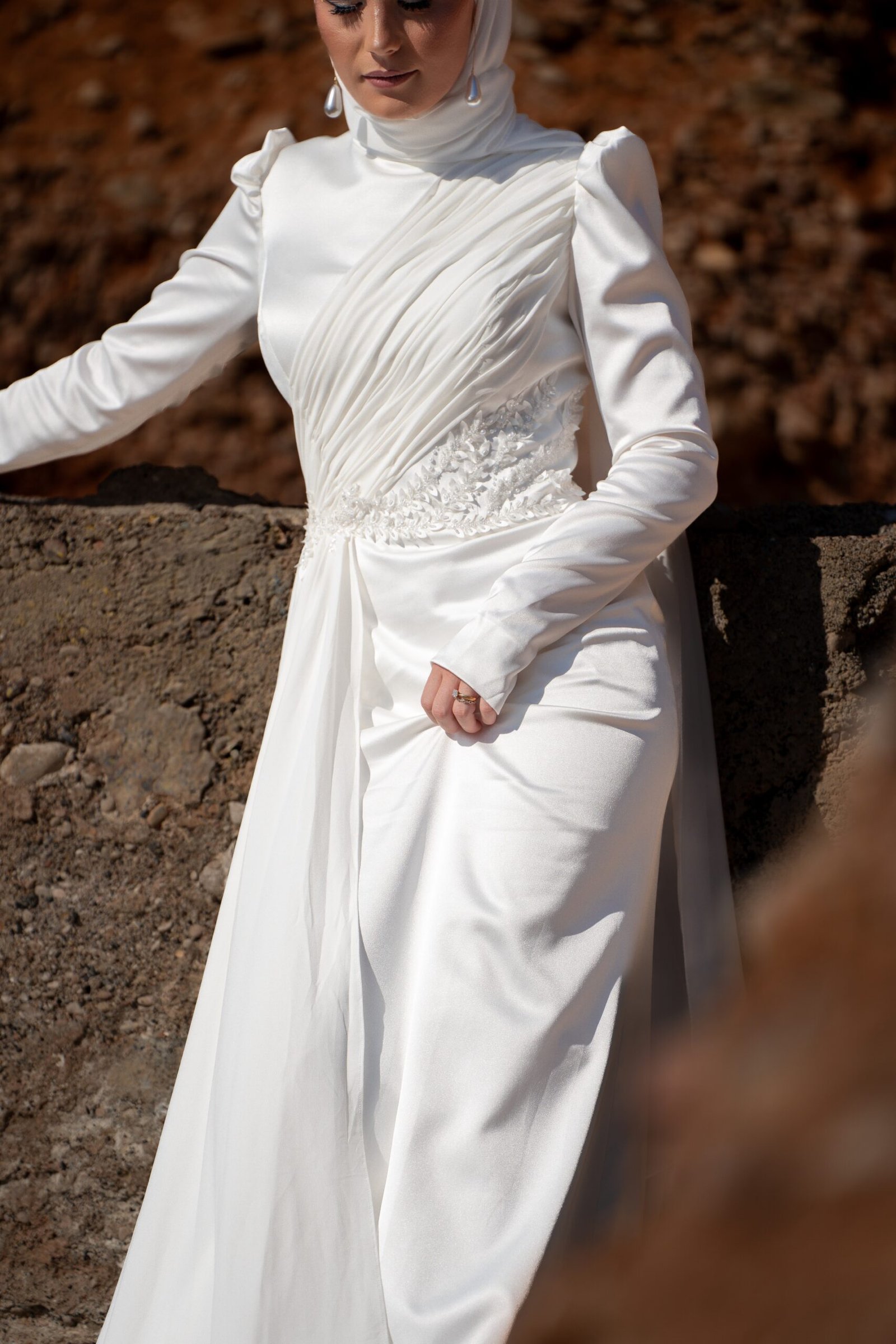 Son drapé latéral épouse le buste avec légèreté, tandis que la taille se pare de dentelle brodée, symbole d’une féminité éternelle.